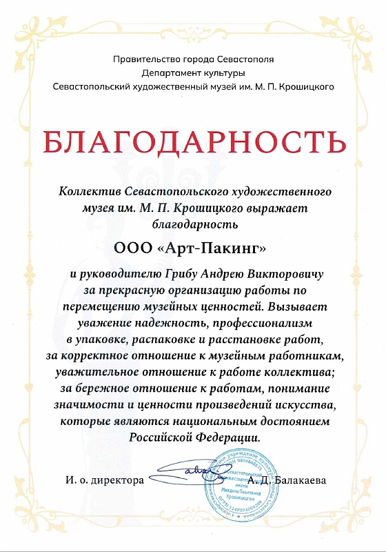 «Коллектив Севастопольского художественного музея им. М. П. Крошицкого выражает благодарность ООО «Арт-Пакинг» и руководителю Грибу Андрею Викторовичу за прекрасную организацию работы по перемещению музейных ценностей. Вызывает уважение надежность, профессионализм в упаковке, распаковке и расстановке работ, за корректное отношение к музейным работникам, уважительное отношение к работе коллектива; за бережное отношение к работам, понимание значимости и ценности произведений искусства, которые являются национальным достоянием Российской Федерации.»