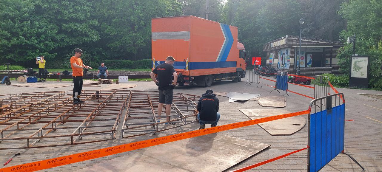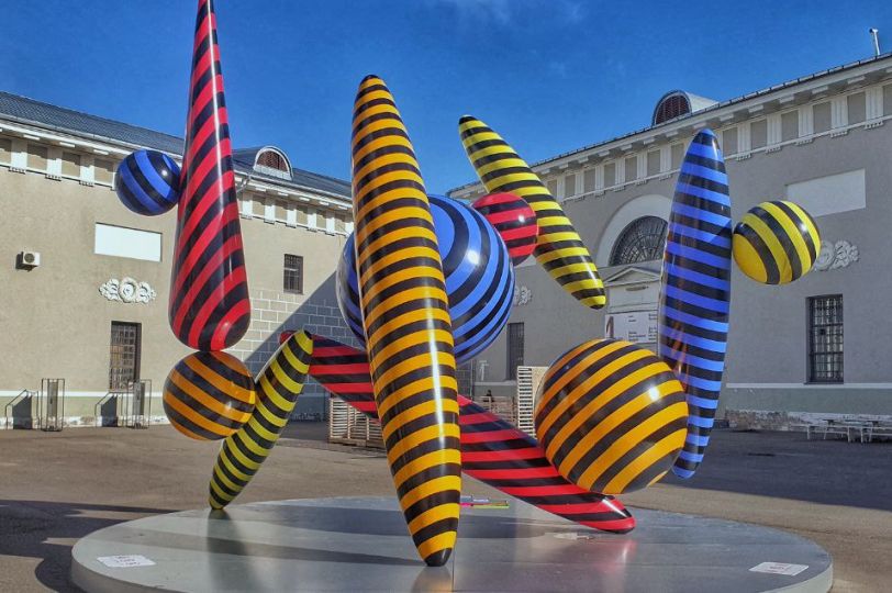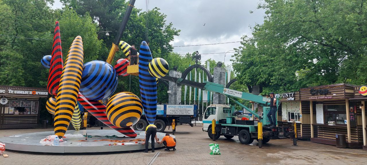 Яркая инсталляция – «Композиция в черную полоску» – появилась у центрального входа в парк «Фили», со стороны улицы Барклая. Это работа столичного художника и скульптора Романа Ермакова.