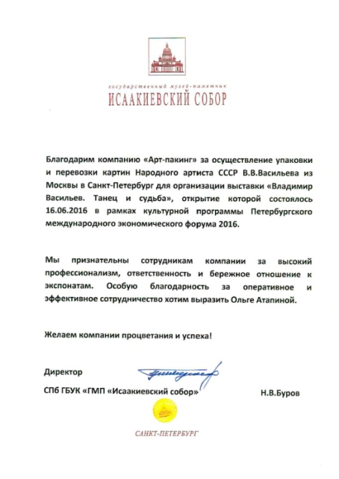После упаковки перевезли картины из Москвы в Санкт-Петербург на выставку «Владимир Васильев. Танец и судьба» которая состоялась в государственном музее-памятнике «Исаакиевский собор». На выставке было представлено более 80 живописных работ мастера. Кроме картин так же будут выставлены скульптуры и фотографии других авторов. Выставка оформлена современными дизайнерами Петербурга.